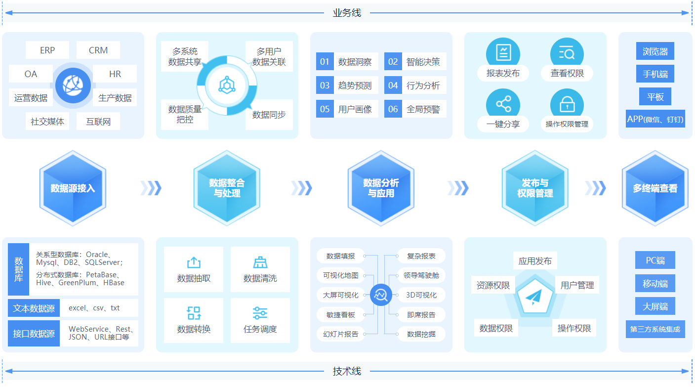 ABI(ALL in one BI)是億信華辰深耕商業(yè)智能領(lǐng)域十多年,在豐富的數(shù)據(jù)分析挖掘、報(bào)表應(yīng)用等經(jīng)驗(yàn)基礎(chǔ)上,自主研發(fā)的一款融合了ETL數(shù)據(jù)處理、數(shù)據(jù)建模、指標(biāo)管理、數(shù)據(jù)可視化、數(shù)據(jù)分析、數(shù)據(jù)填報(bào)、移動(dòng)應(yīng)用等核心功能而打造的全能型數(shù)據(jù)分析平臺(tái)。